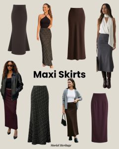 Statement Skirts – From satin skirts to bold statement shapes, skirts are central to spring outfits, whether midi or maxis, flared or structured.  Style with a simple tee and sneakers for high/low contrast.